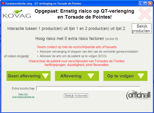 KU Leuven, KOVAG en Officinall hebben de handen in elkaar geslagen om bovenstaande richtlijn te implementeren in de software. Dit bespaart de apotheker heel wat tijd. De software bepaalt immers niet alleen de geneesmiddelen met risico op QT-verlenging vanuit de historiek van de patiënt maar berekent ook automatisch de risicoscore. Indien het blijkt dat er voor de patiënt een risico is, krijgt de apotheker een pop-up op het scherm (zie onderstaand voorbeeld). Deze pop-up verschijnt enkel als er effectief actie moet ondernomen worden. De pop-up geeft alle nodige informatie weer zodat de apotheker geen extra opzoekwerk hoeft te doen. Voordeel voor de patiënt en de apotheker!
